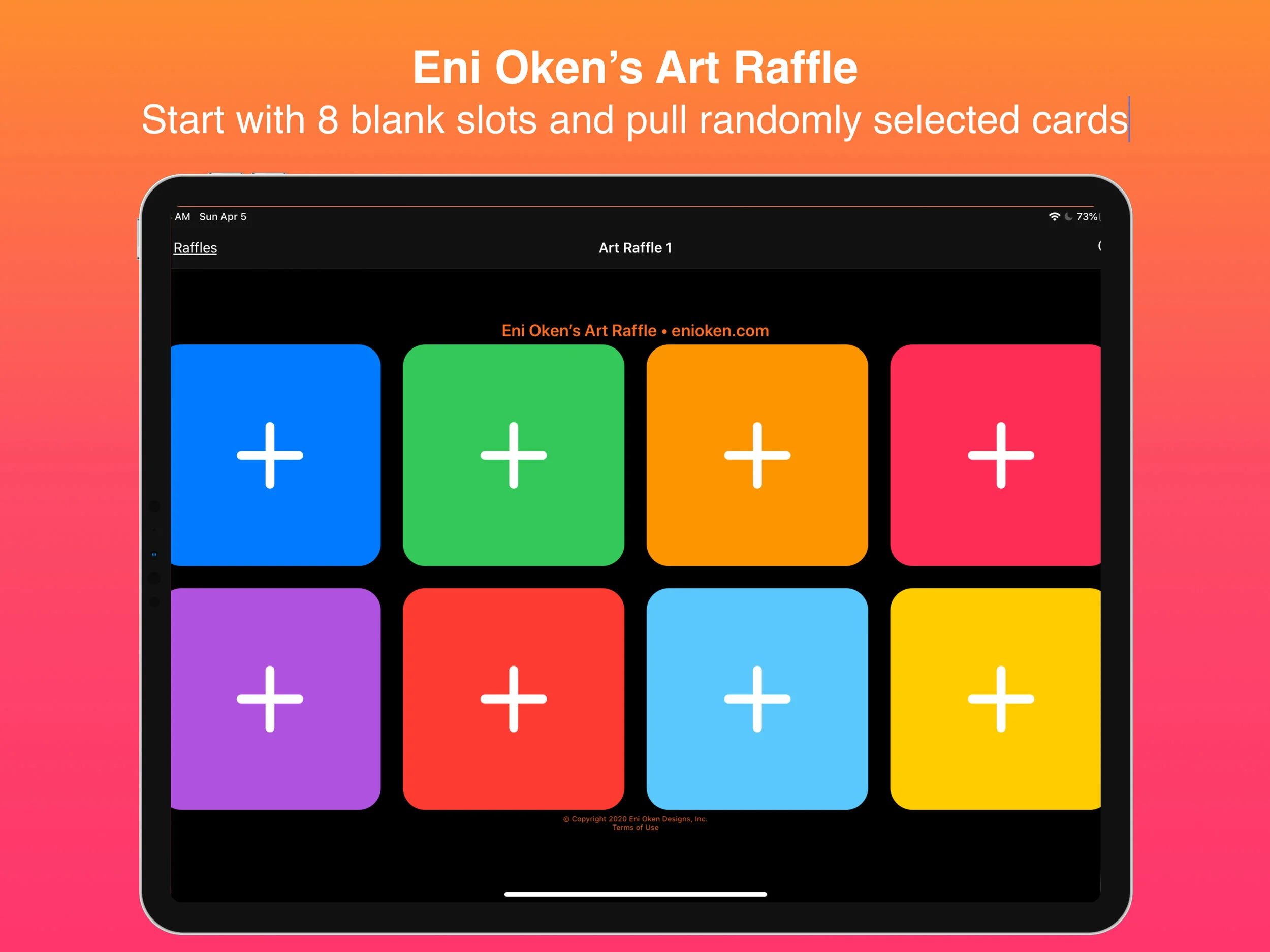 You may share screenshots of the app on social media for your own personal use, as long as the images are UNCROPPED AND VISIBLY SHOW THE WORDS ENI OKEN'S ART RAFFLE. Additionally, proper attribution is always required, such as “Captured from Eni Oken's Art Raffle app”.
