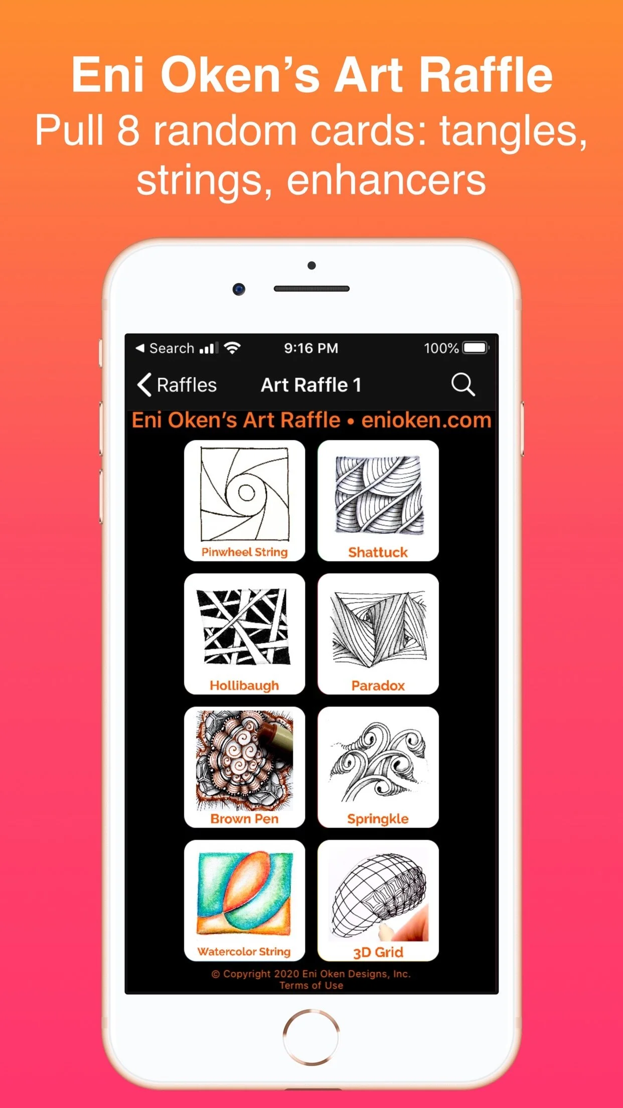 If you are a CZT (Certified Zentangle Teacher), you may use the app in any of your classes, as long as all other Eni Oken Designs, Inc. terms of use and copyright policies are respected.