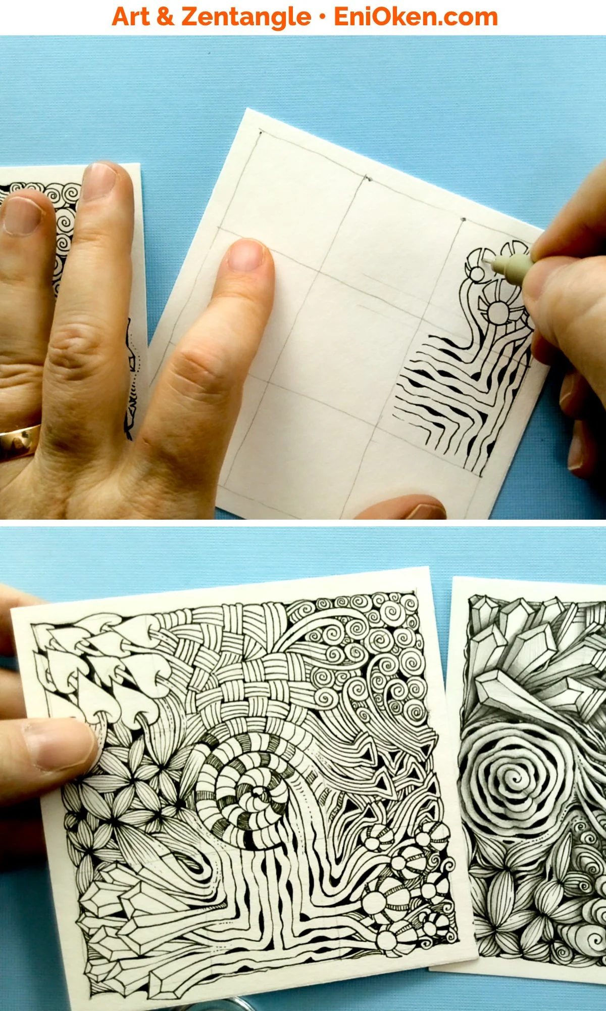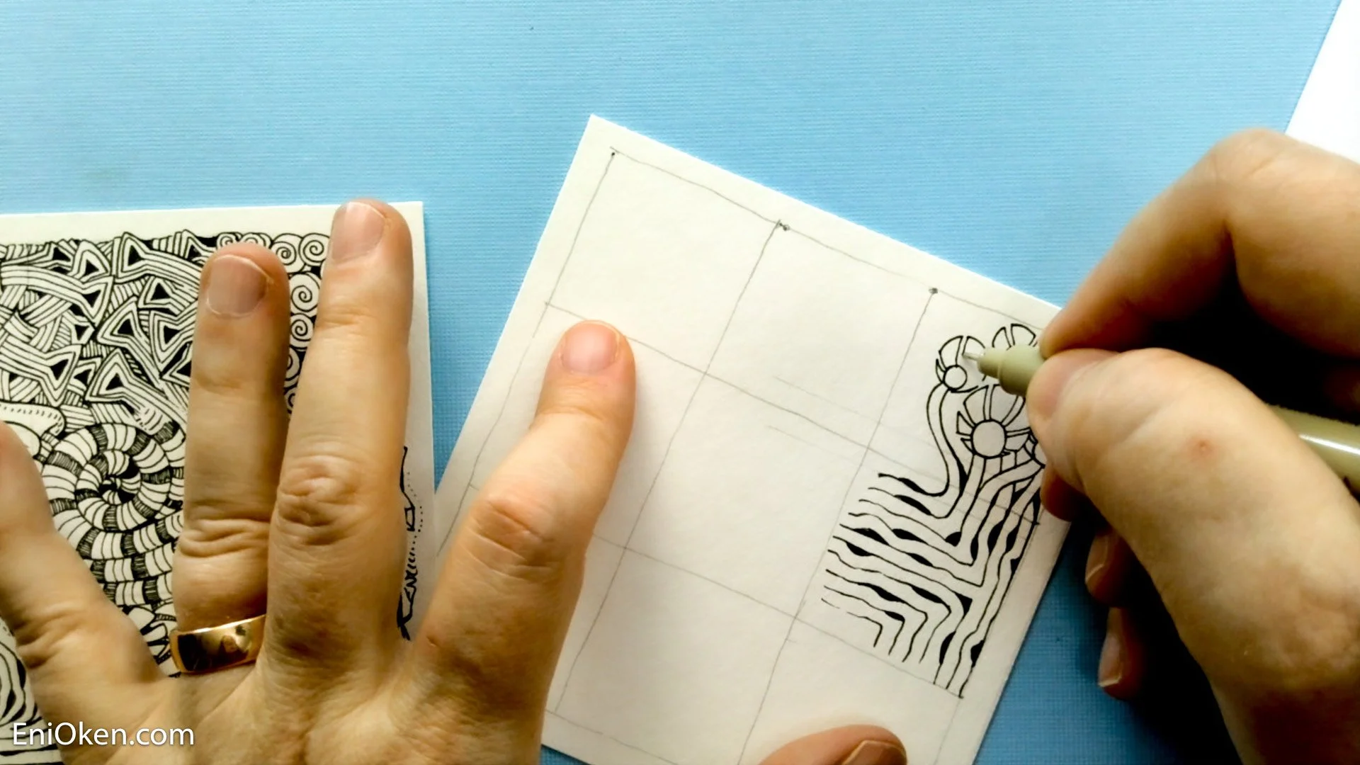 This is the project we worked on, a simple 9 section square grid, each one filled with a different tangle: