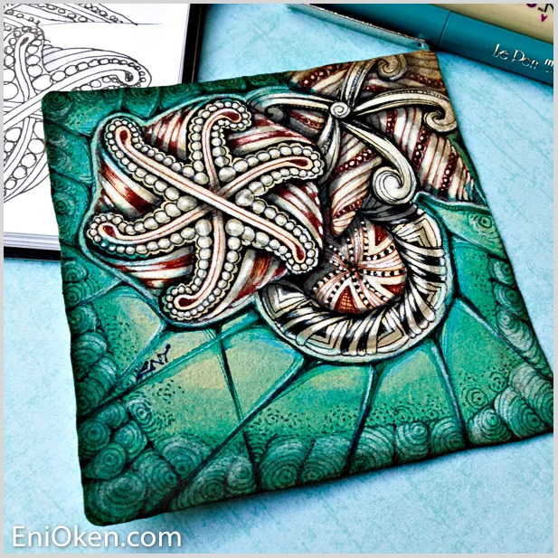 Below you can see other converted tangles such as Slab (deconstructed by Shazia), Narwal (Sam Taylor) and single Mooka (Zentangle), inked in brown and black over Renaissance tan tile.