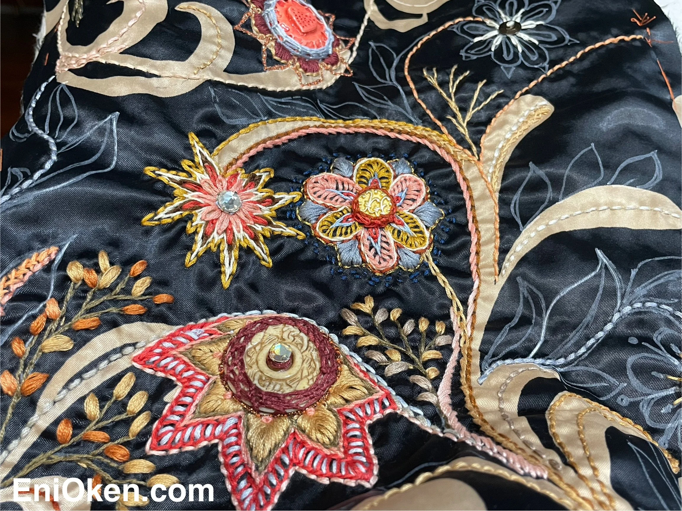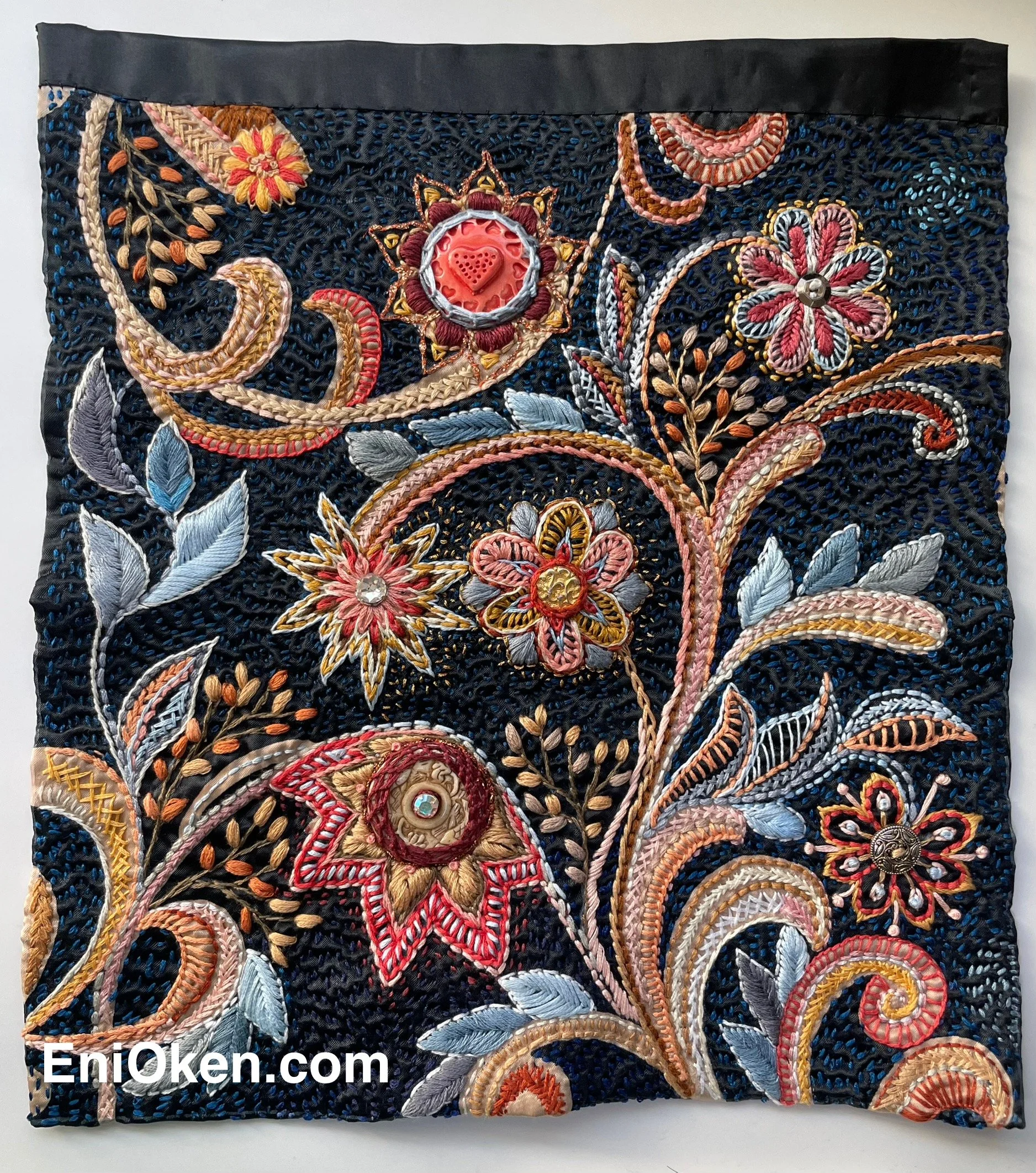 This piece of fabric measuring roughly 8x8 inches was extracted from a dress that no longer fit me but still had emotional significance. I padded it with felt and embroidered freeform, adding leaves and flowers randomly.