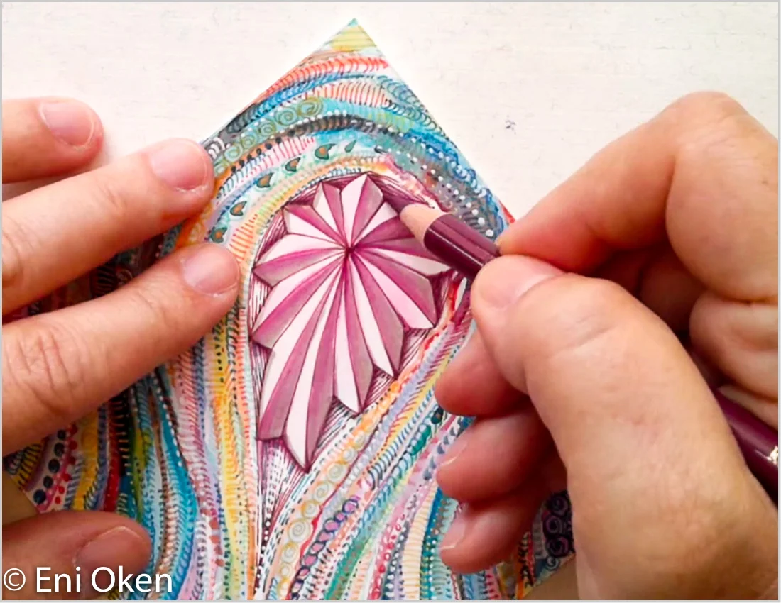 At the end of the lesson, you'll get a little bonus, learn how to combine Fantasy Agates with Blossom tangles to create beautiful backgrounds. In this example below, I combined Fantasy Agates with the tangle Gneiss, treated with watercolors and colored pencils.