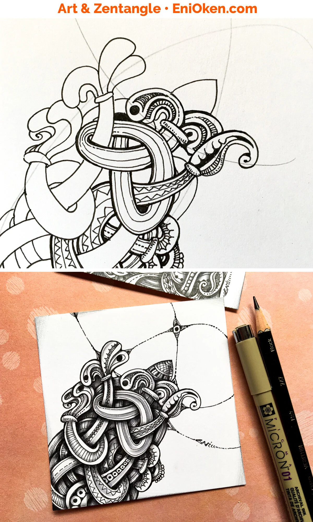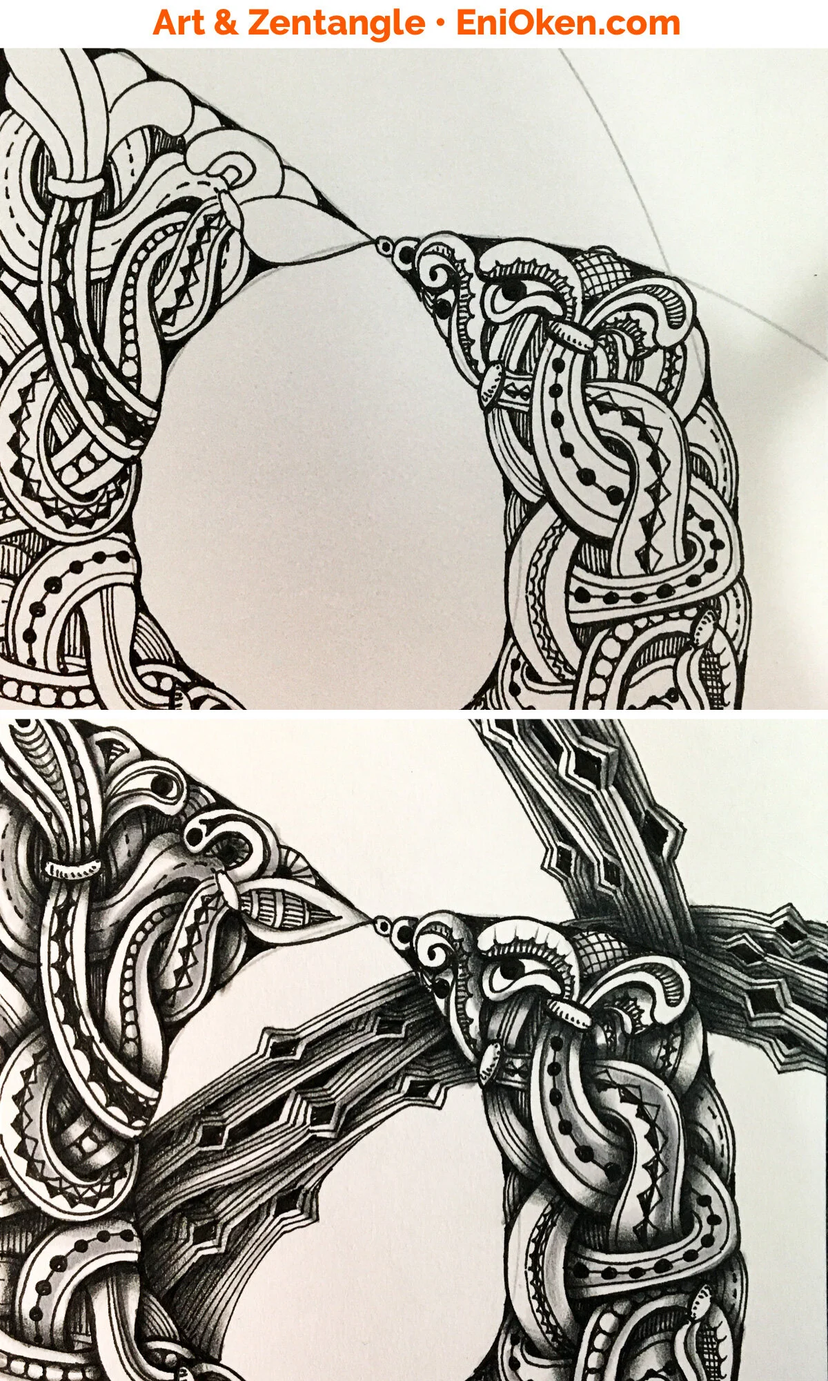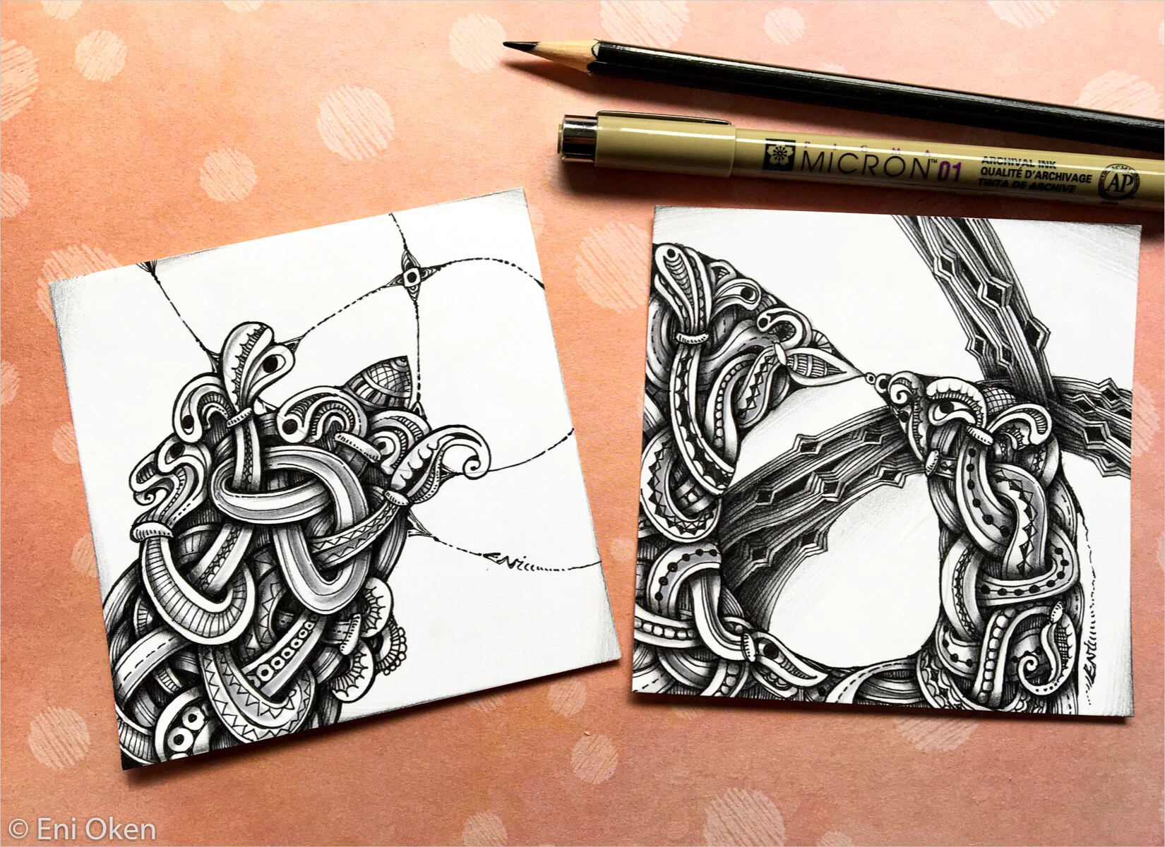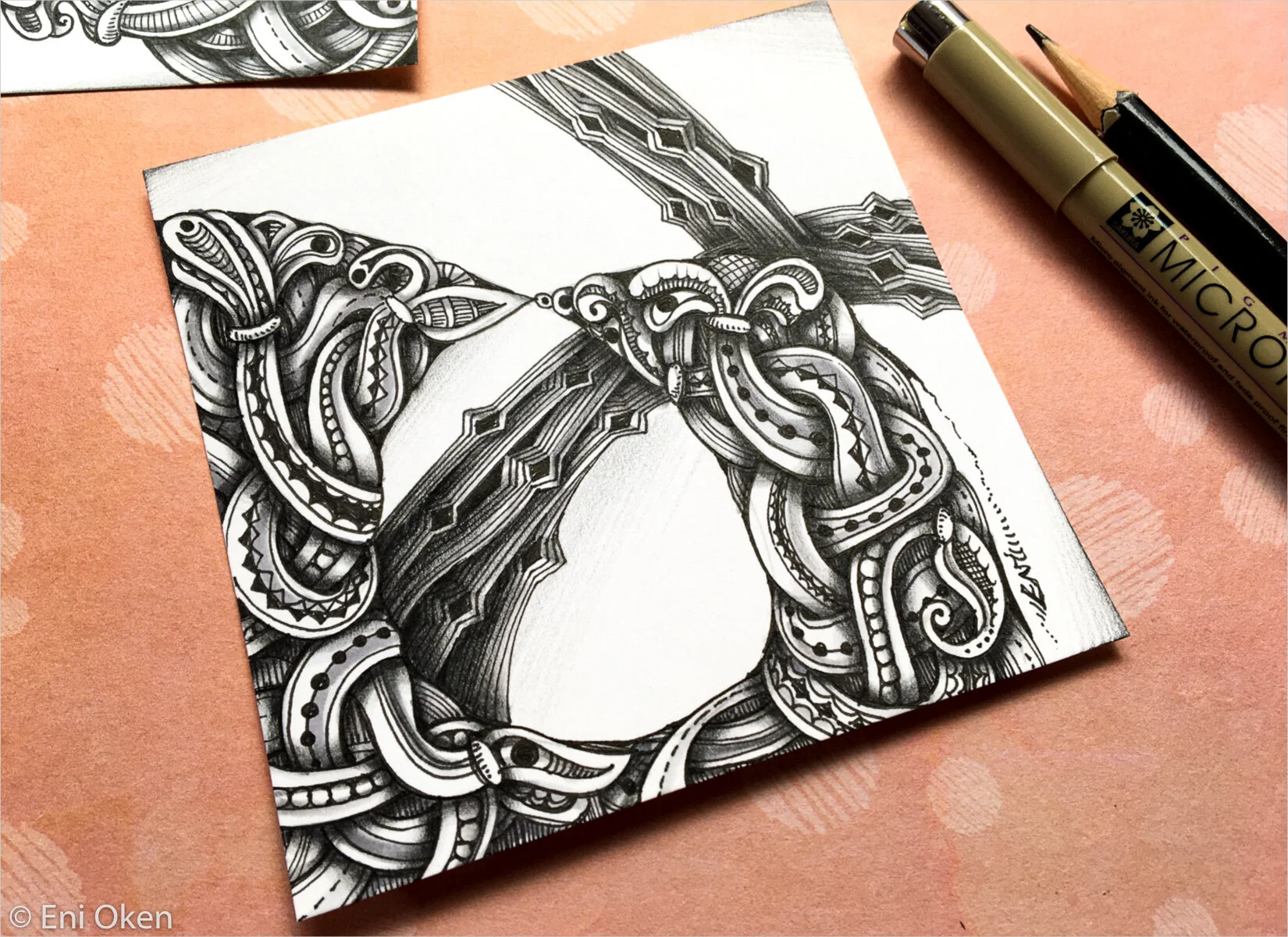 Except, these aren’t real knots, they are a Viking inspired versions of the tangles Jaysix (Eni Oken) and Yah (Emily Classon). It’s the terminals and the decoration and the shading that make them feel Viking style.