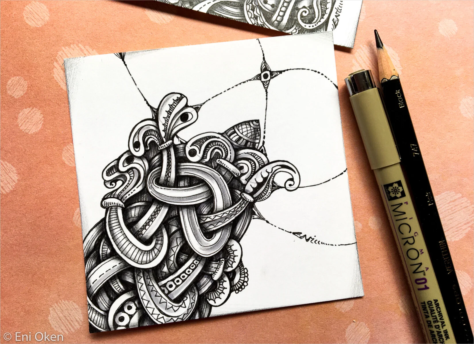 A group of friends pulled out an Art Raffle, and there were just too many tangles I love, I couldn't resist. The only change I made was the string, I used a Mirrored string instead of the original. Tangles were Kercott (Yuru Chen), Bilt (Lisa Skeen), Medusa (Tomas Padros), Ravel (Zentangle) and Freeform knots. I also added some Fishskirt for good measure.