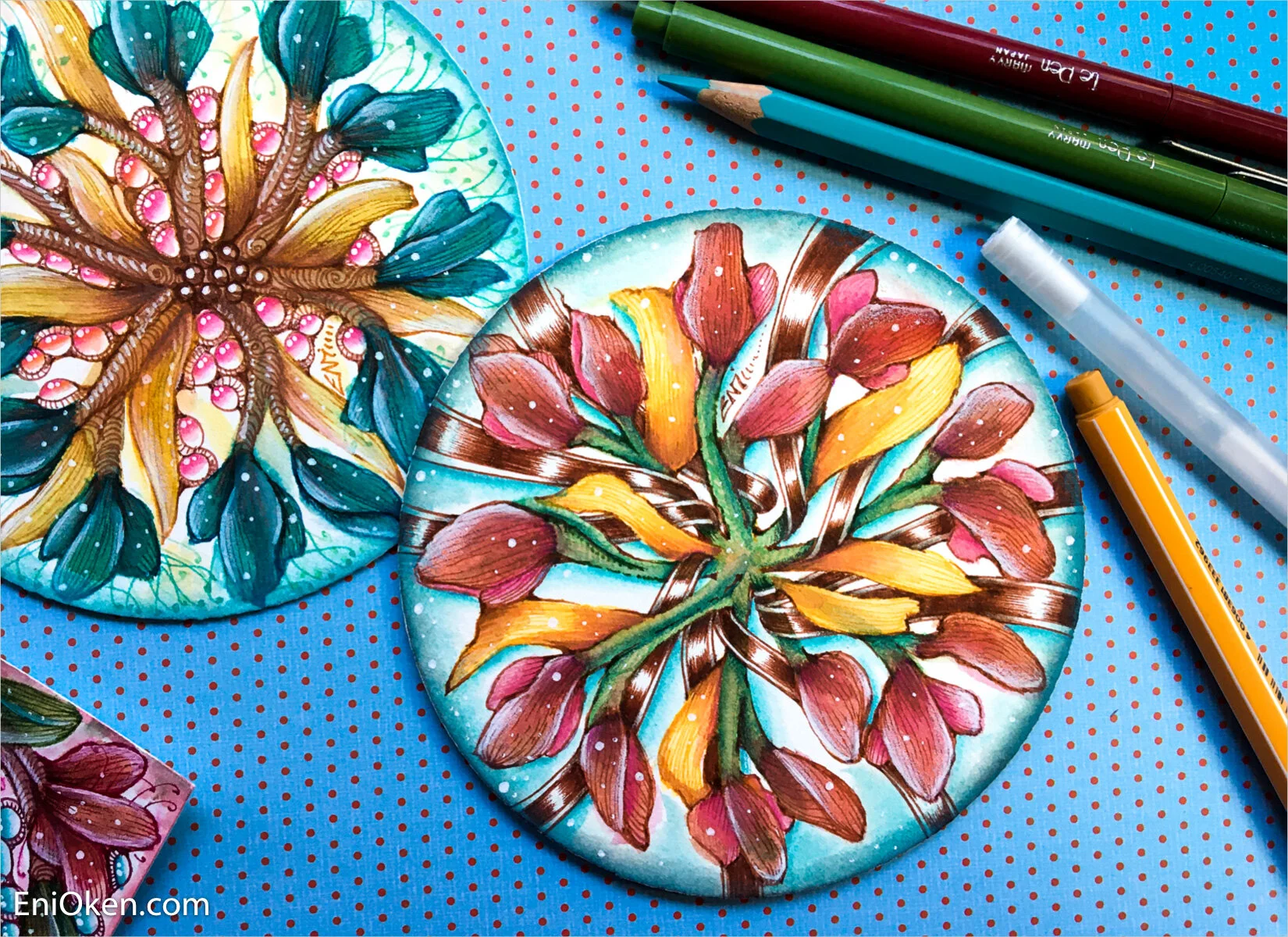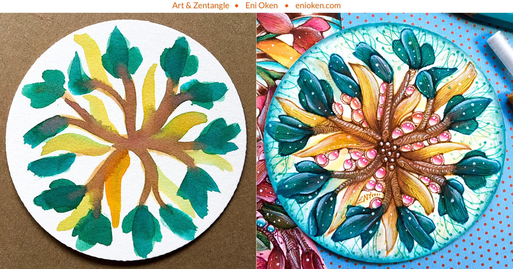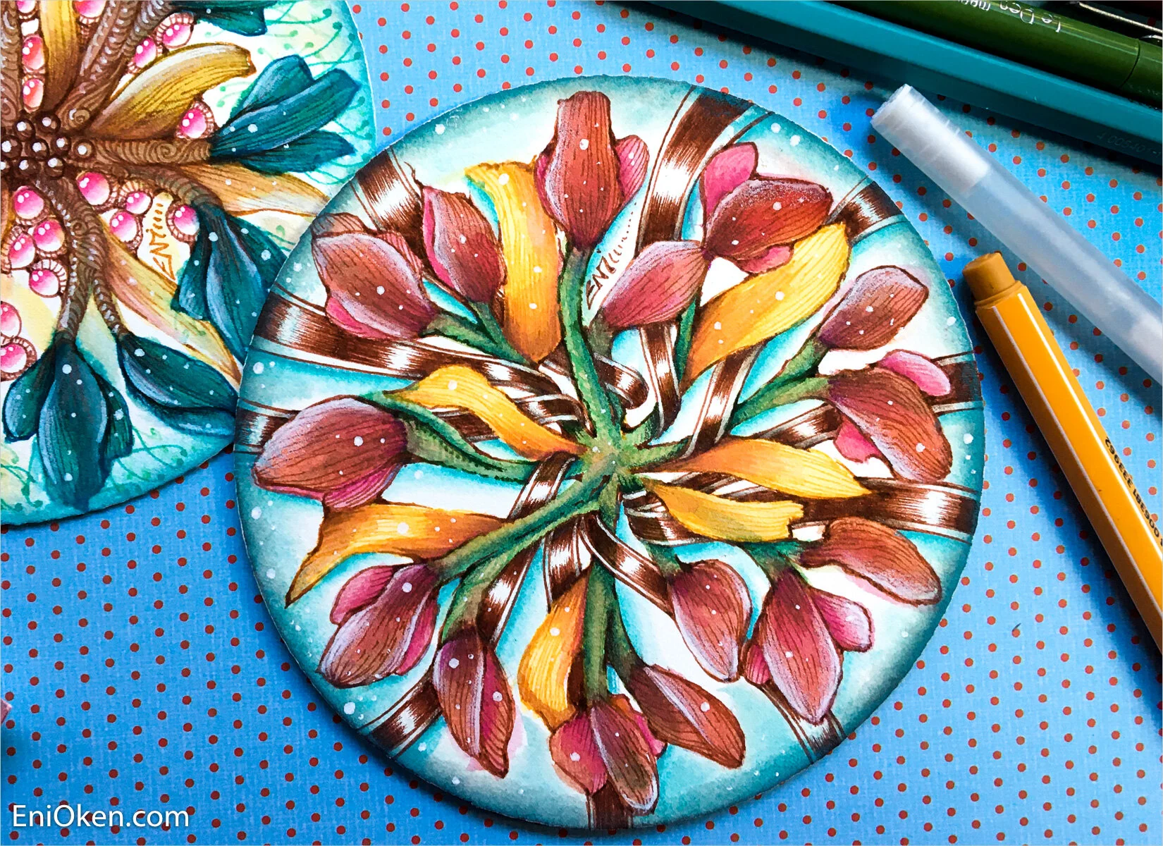 This is the first Found Flower Zendala I made. You can see the underpainting using Ecoline watercolors on the left, and how I added exactly the same treatment as my previous Found Flowers pictures: