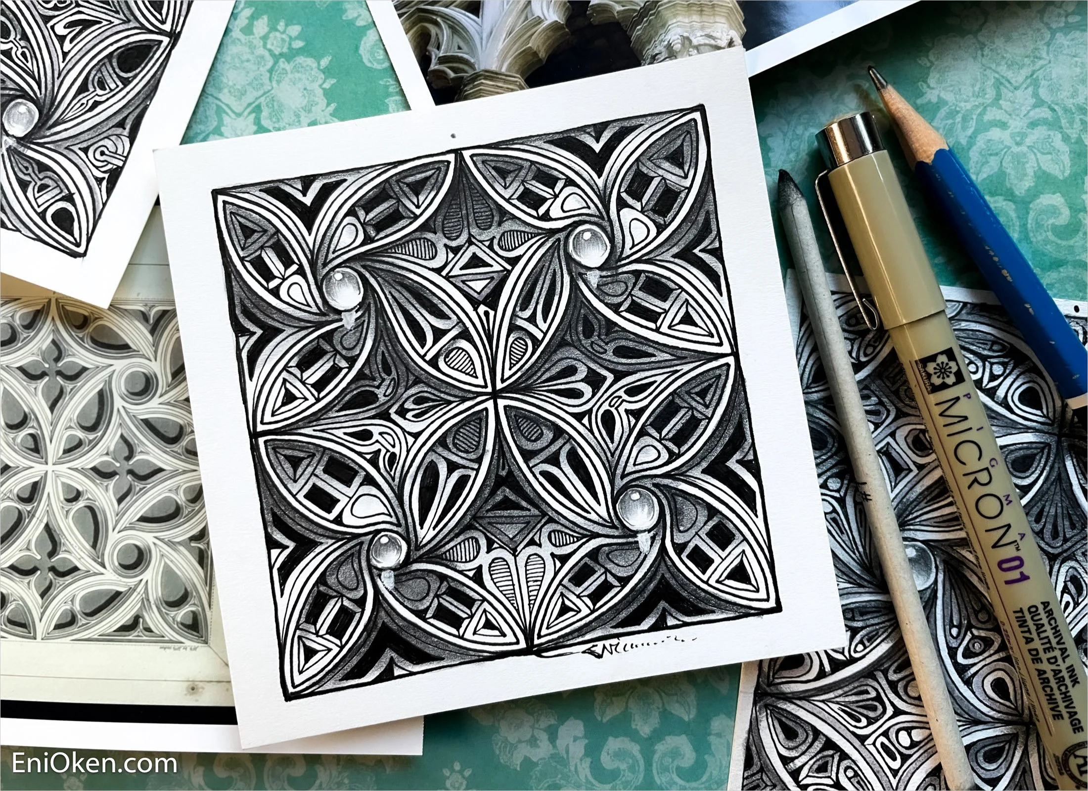 We used the tangle Well (Zentangle) - which was originally inspired in a medieval design - to create a reticulum of sorts.