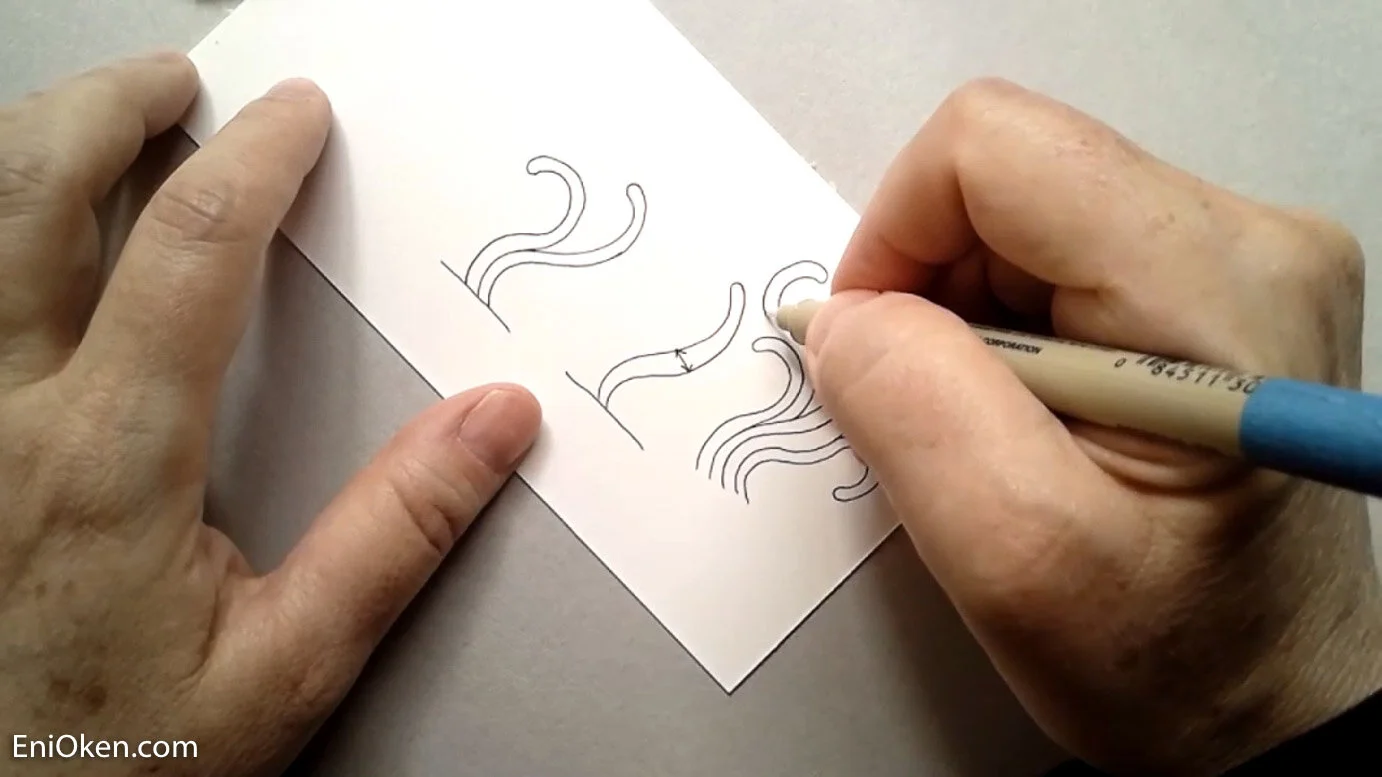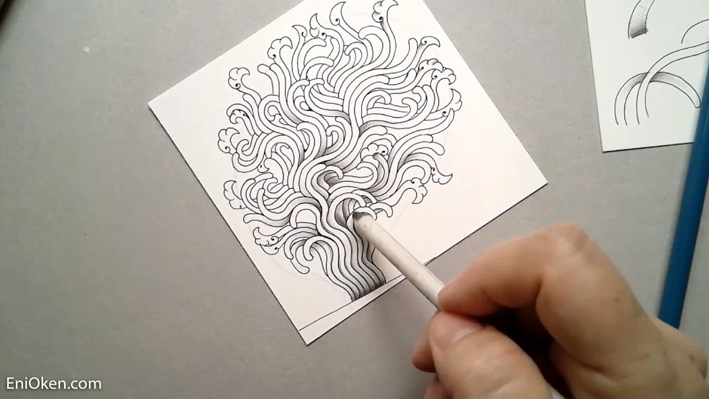 The class started by exploring how to use Hollis, the new pattern by Zentangle founders, exploring all the details of how to work with this new tangle. The new tangle makes heavy use of the S-stroke, and one of the greatest challenges is to keep the strands even and uniform.
