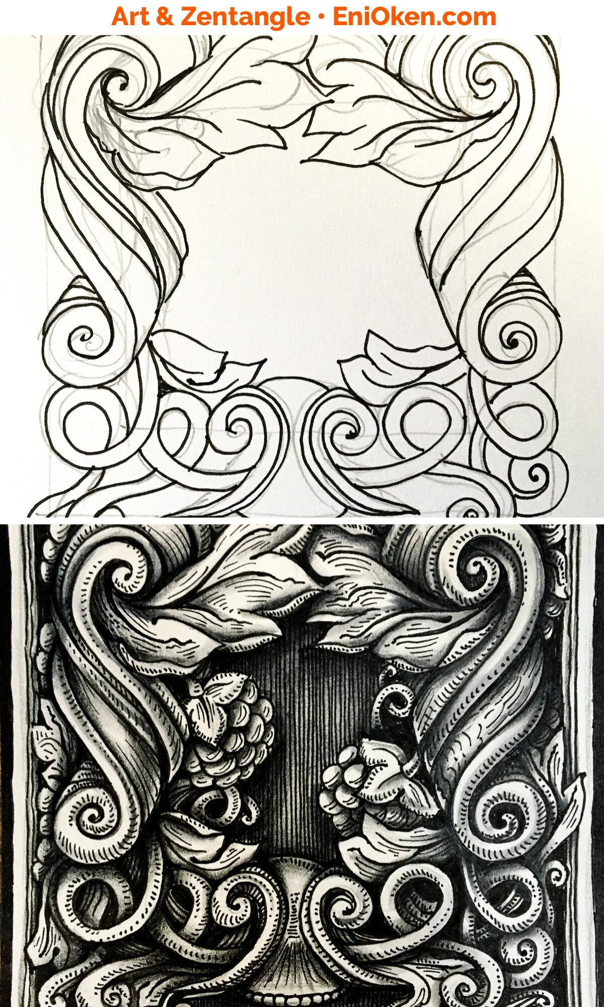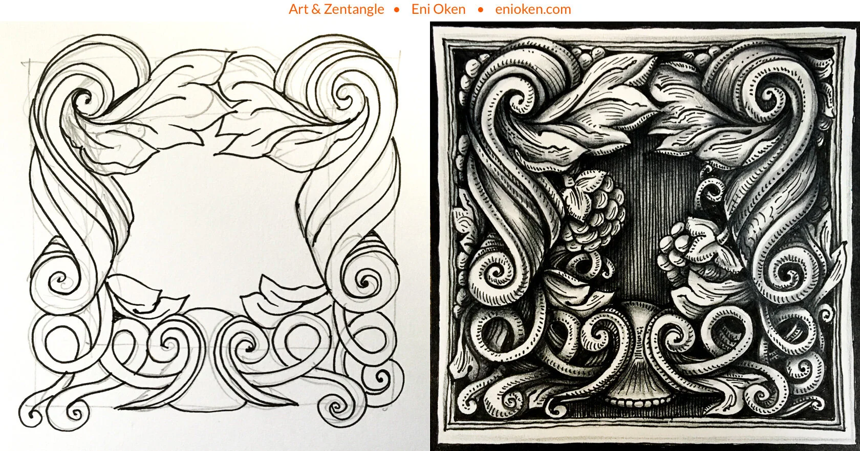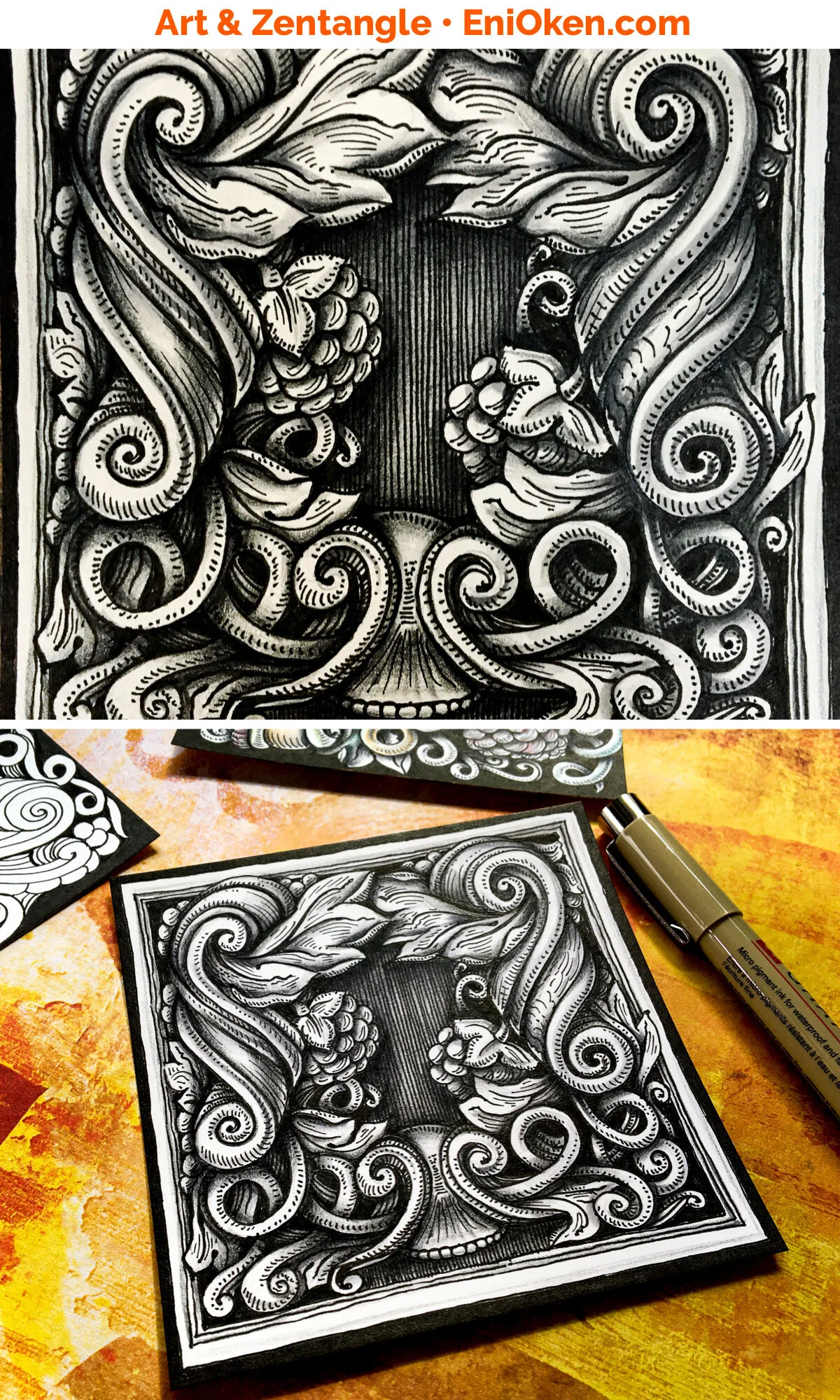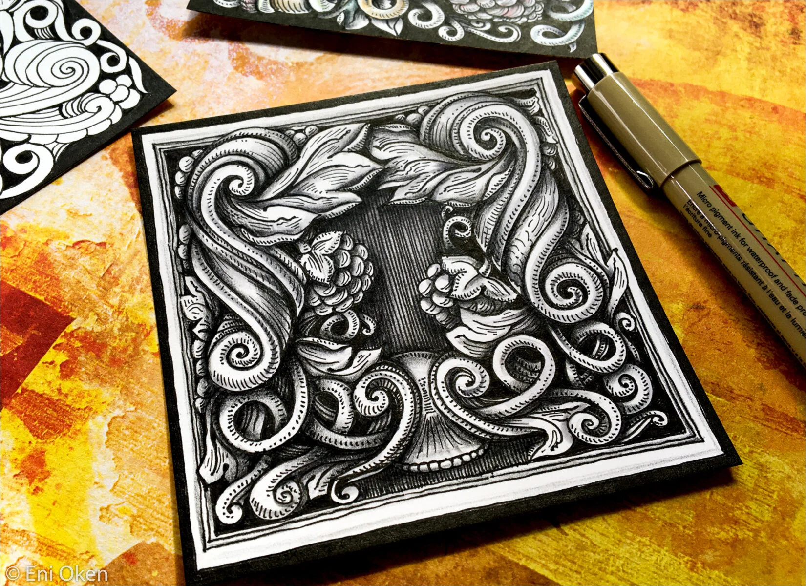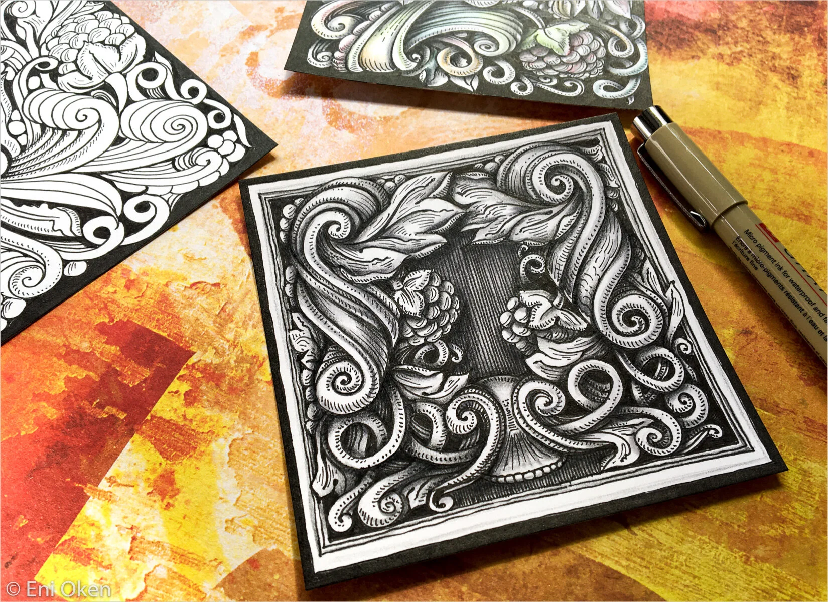 Here’s another picture using Vines and Berries (the topic of my next class). I’m having an absolute blast of a time hatching and creating all those little tiny lines — so much Zen flow and relaxation!