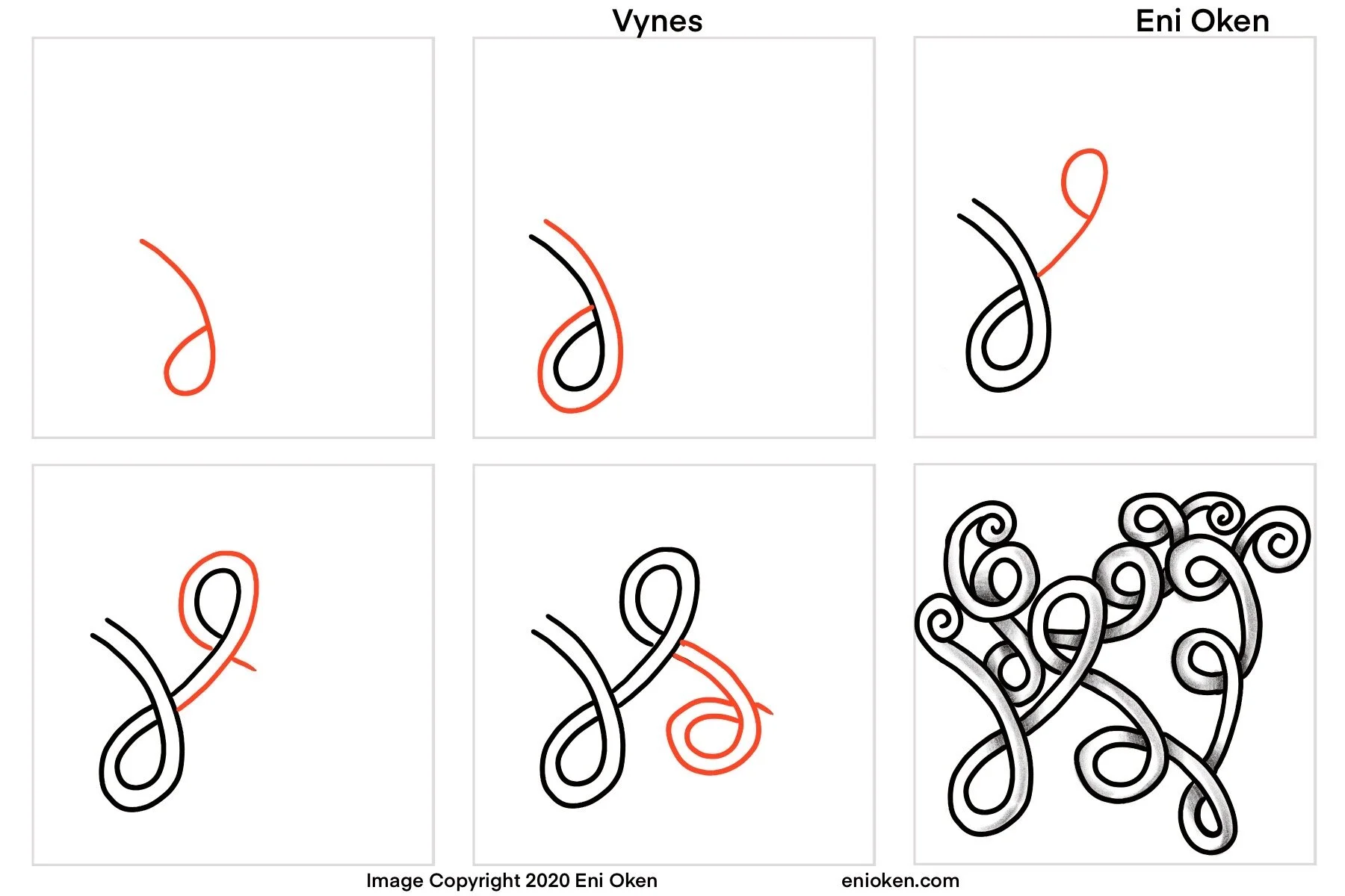 The piece measures only 4x4 inches. The tangle patterns used were Mooka (with depth), Icanthis, Bronx Cheer (all three by Zentangle) and Vynes (my own). Here’s the step-out for Vynes: