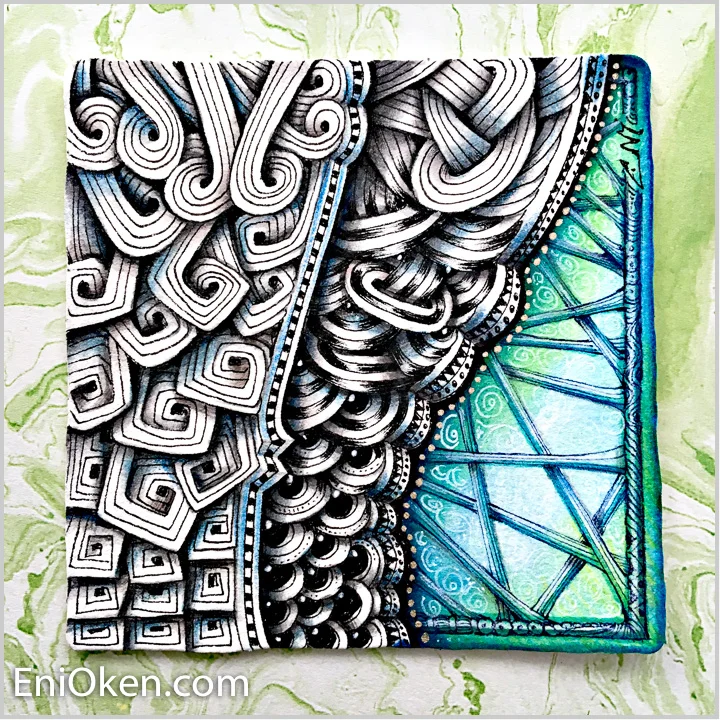 In this tile, the tangle Sandswirl (Karry Heun) gradually morphs into Emingle grid (Zentangle); while in a different section of the grid, Jaysix (Eni Oken) morphs into Caviar (Lori Howe). See how the transformation is gradual? SUPER FUN!
