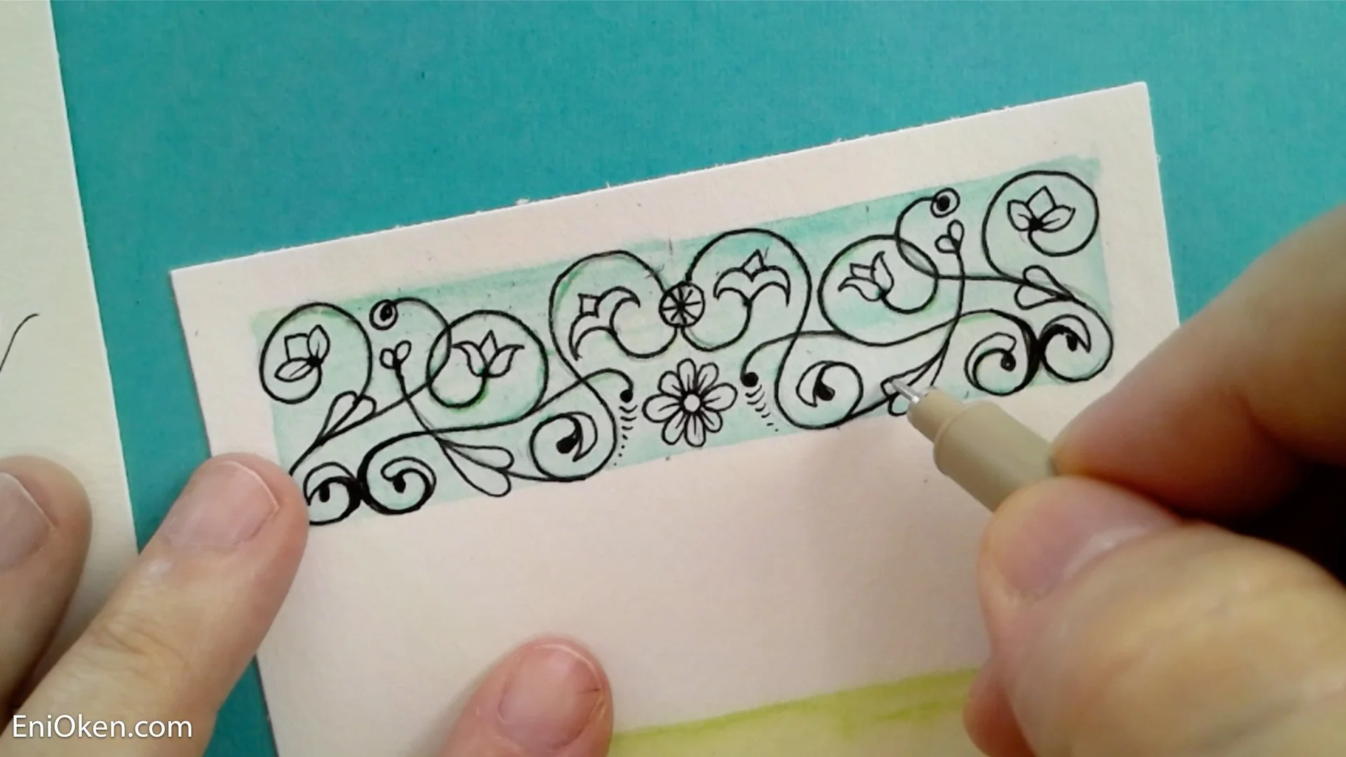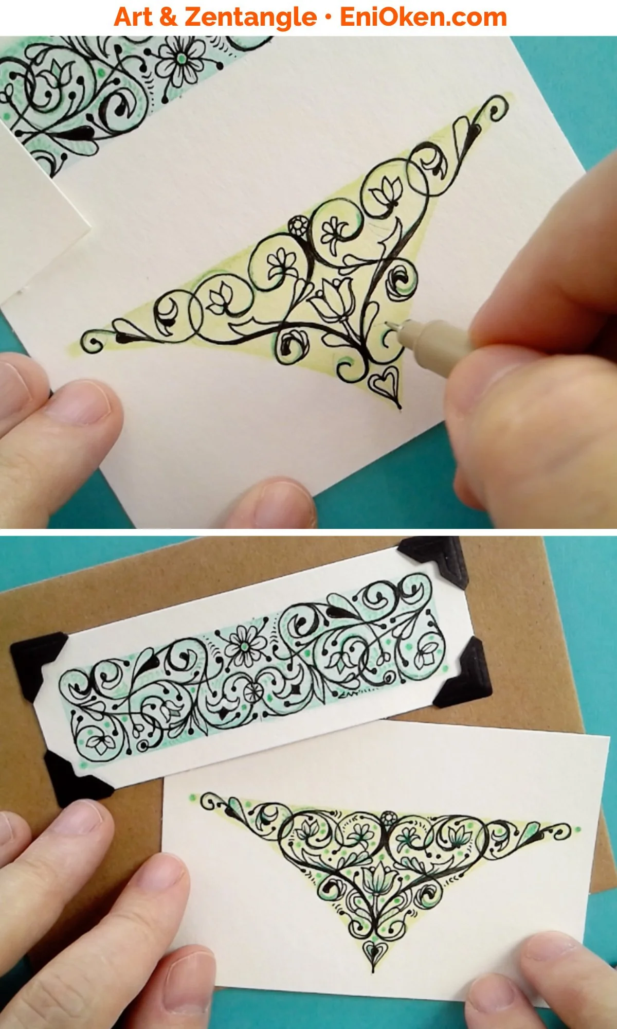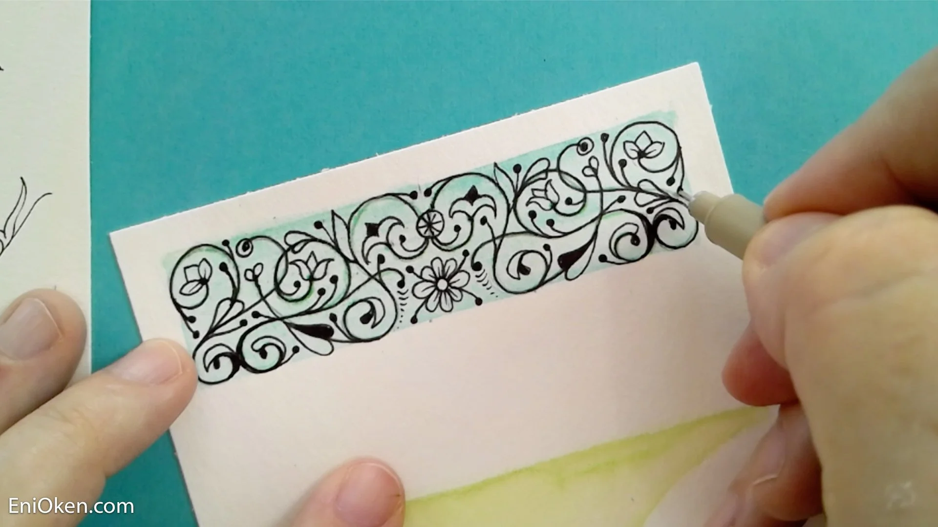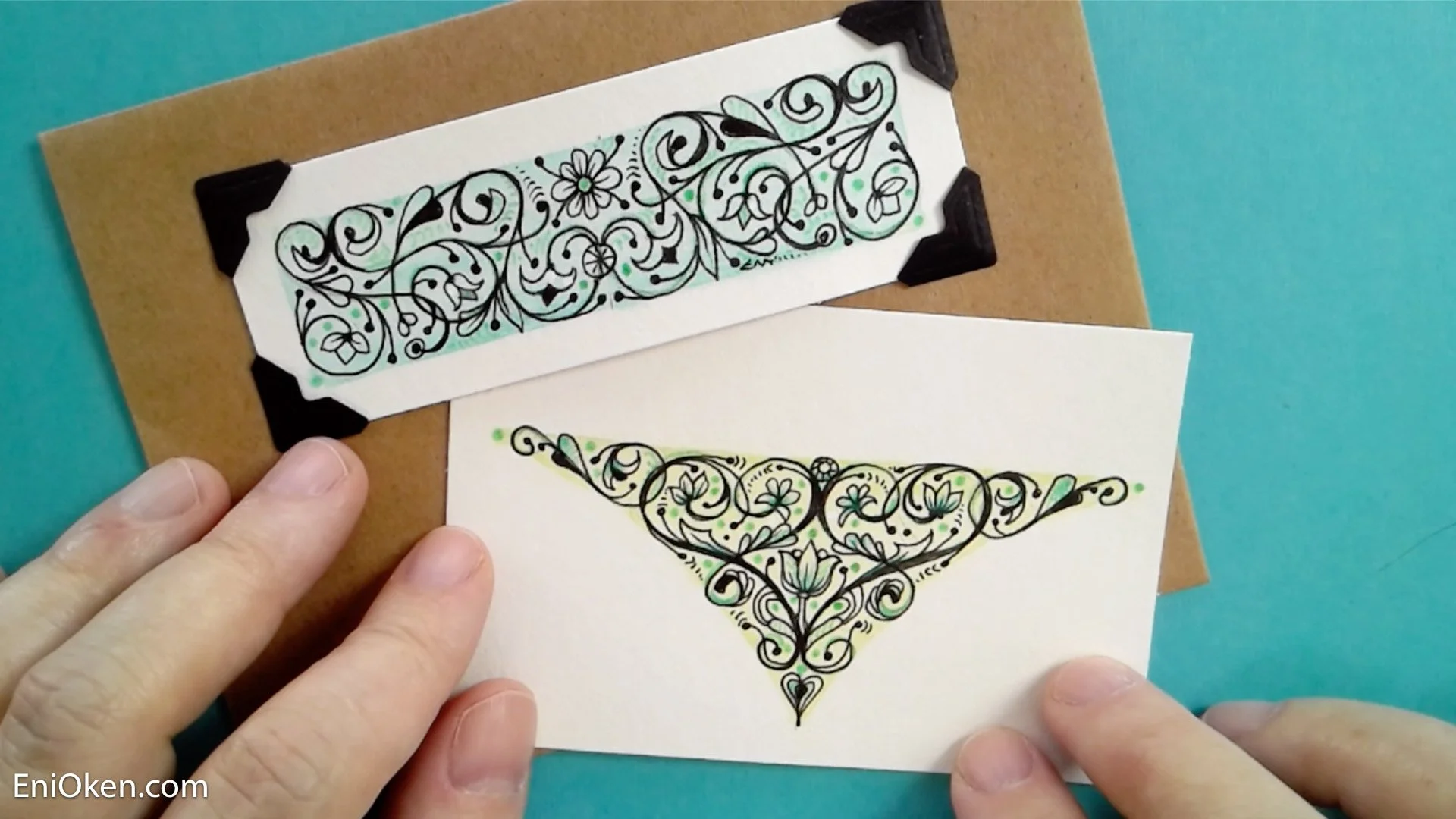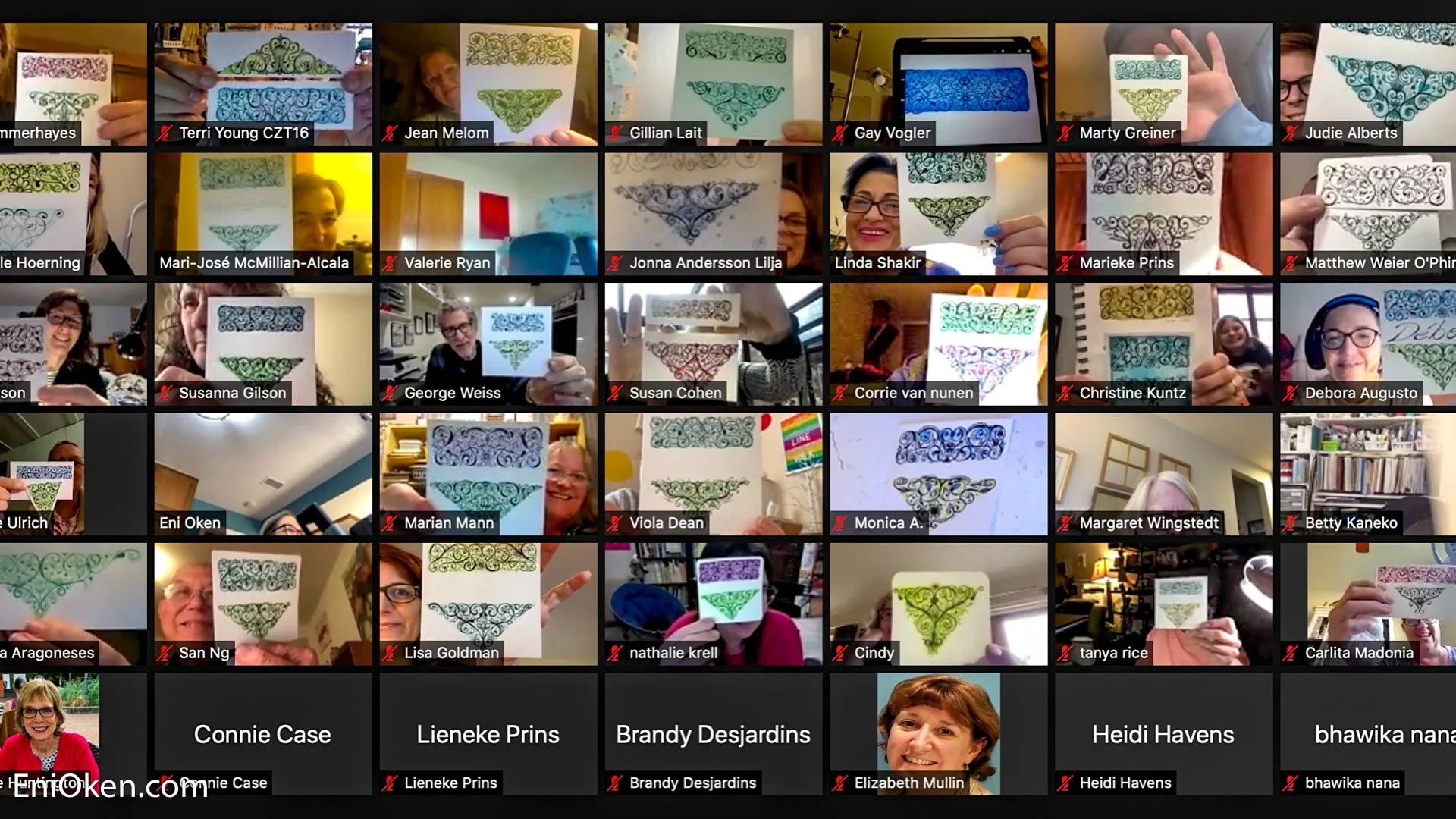 We practiced with Fescu, Pokeleaf and Zinger variations (all three Zentangle tangles) and added embellishments.