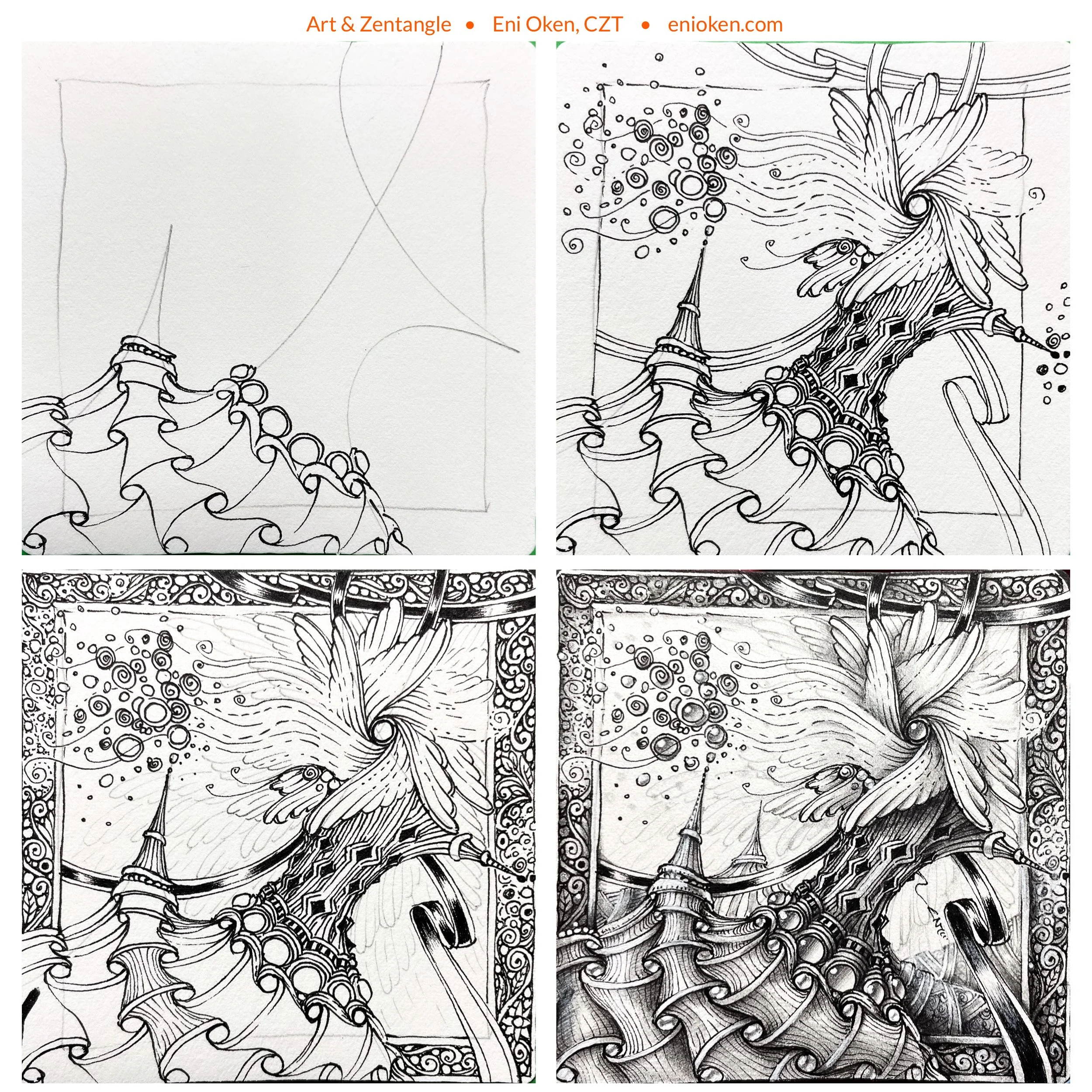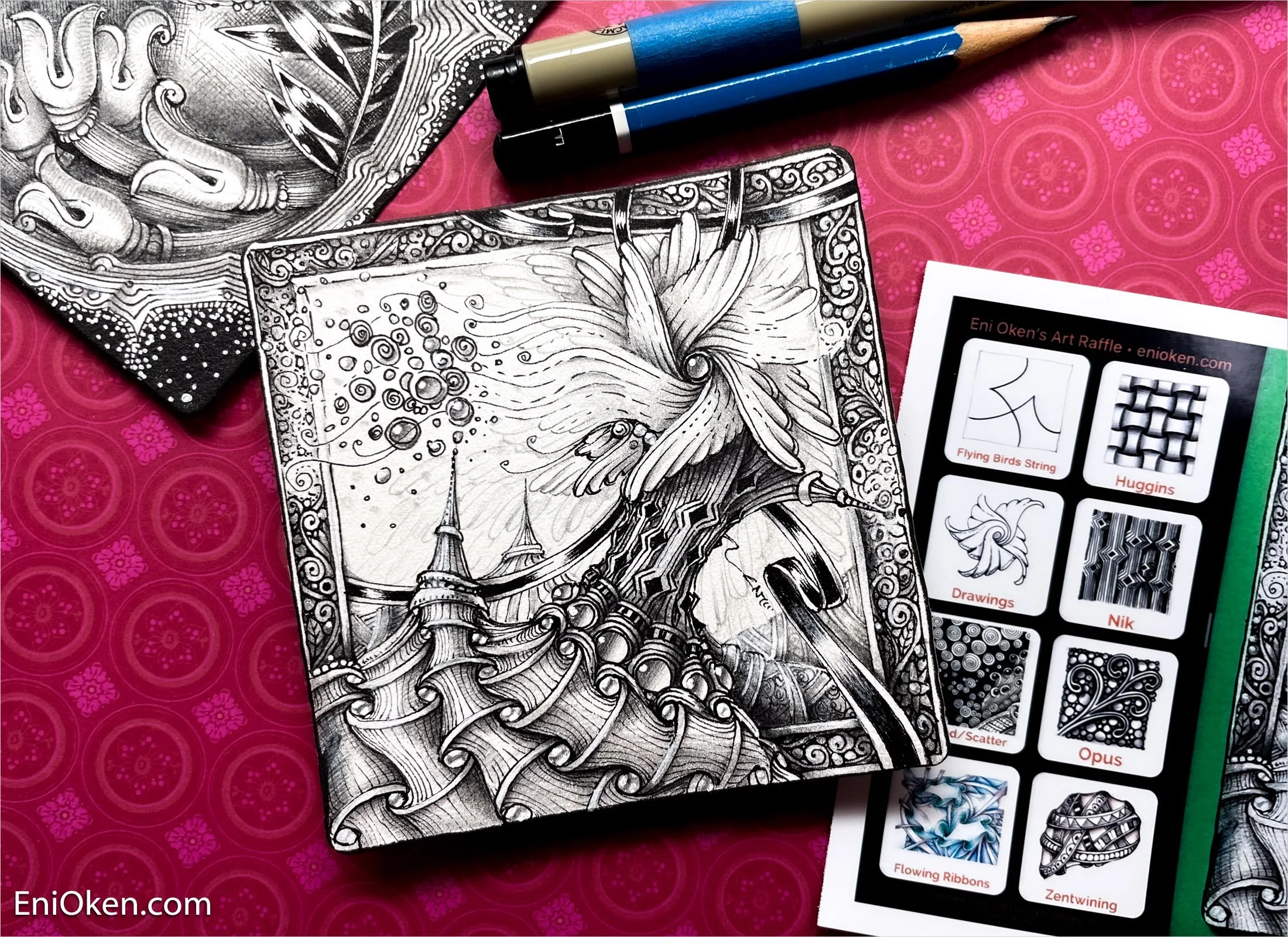 I used the Art Raffle to pick the other tangles, and it gave me Nik (Bunny Wright), Drawing and Opus (Zentangle), and also Scatter, Zentwining (Lynn Mead) and Flowing Ribbons enhancers. All of which I’m pretty familiar with. Here is a close-up for you to inspect: