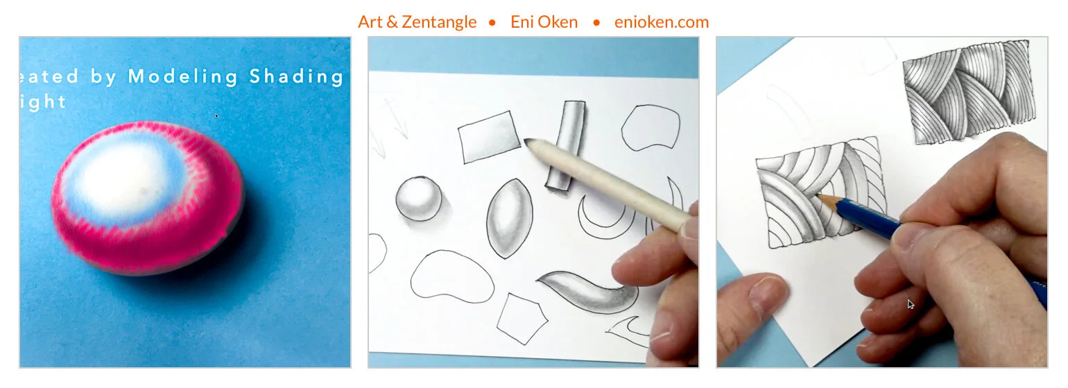 Next, three videos complete the bundle. The first one covers Tangled Shadows, and shows how to understand and draw shadows using a fixed source of light such as the sun. Although this is NOT the classic Zentangle method approach, I use that technique in my own work to create more realistic shadows by shaping shadows that are parallel to the rays of the imaginary sun.