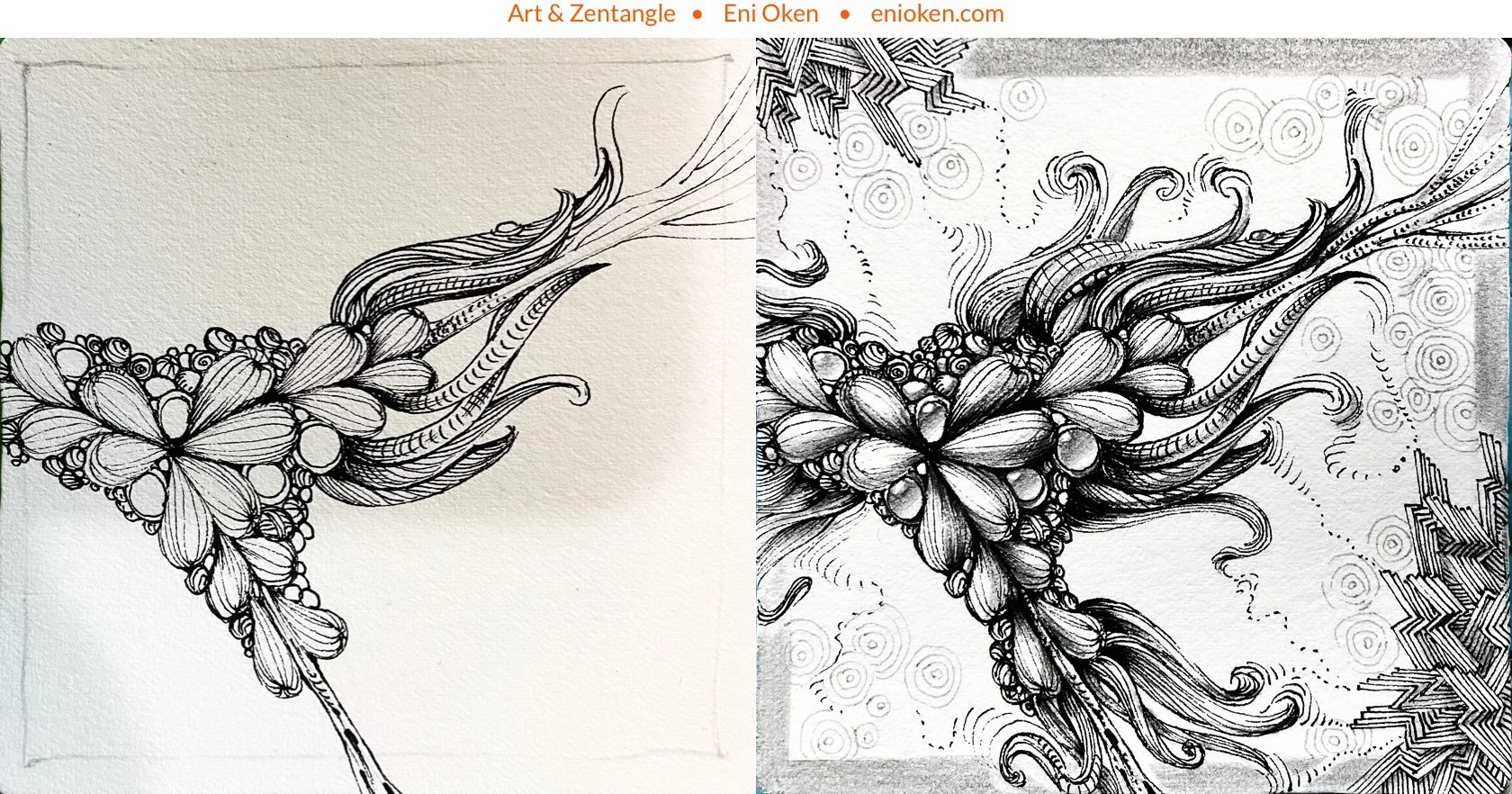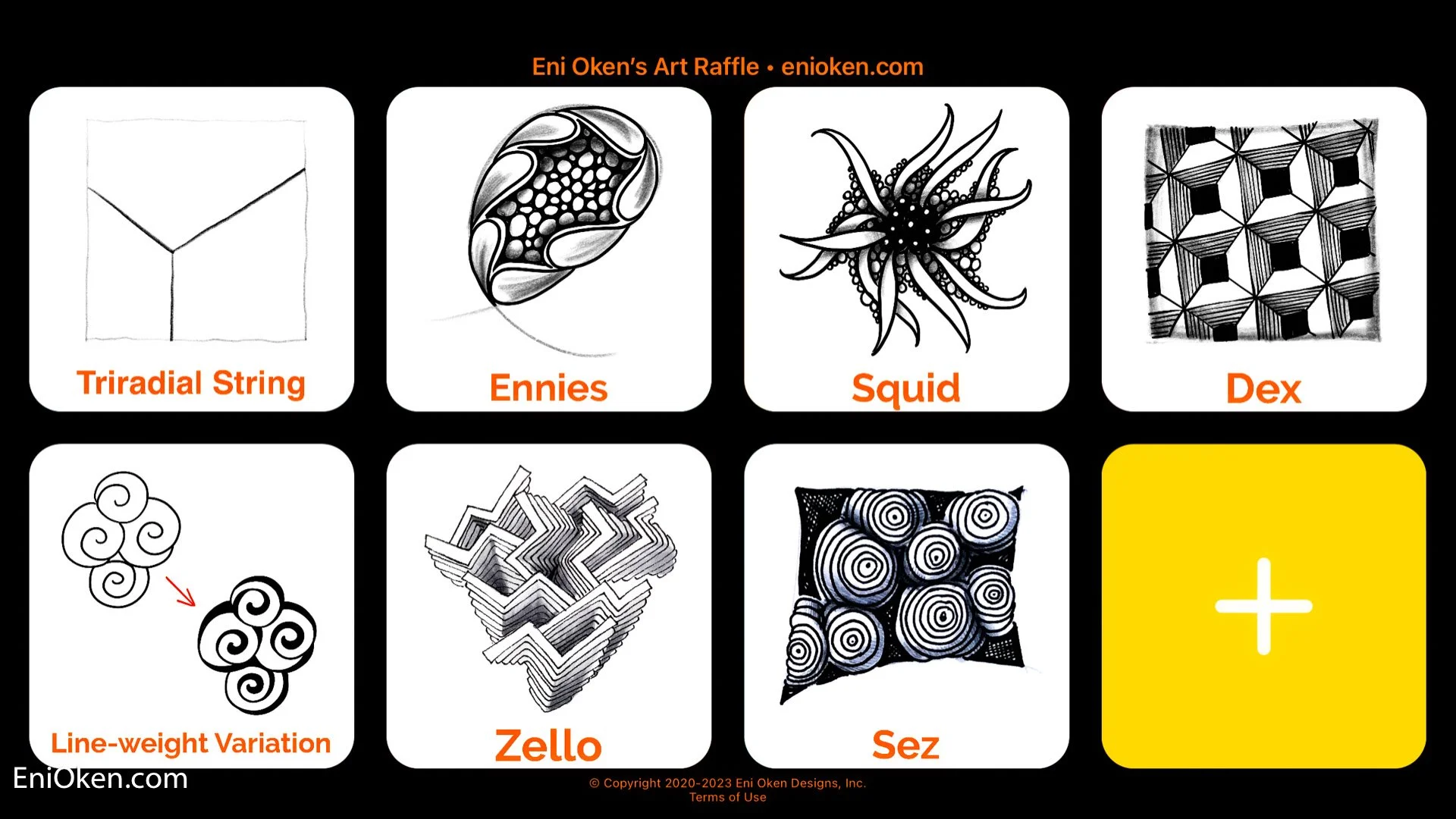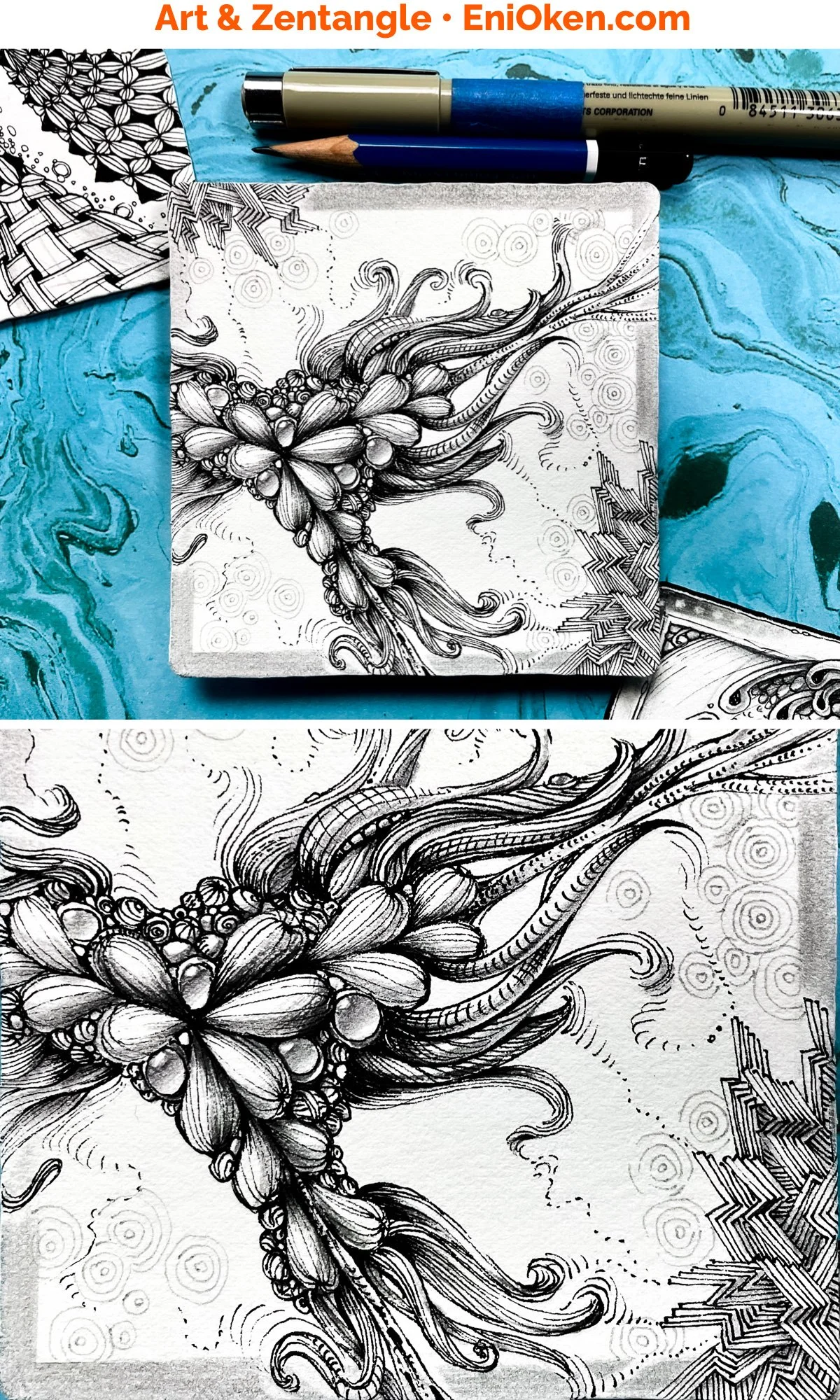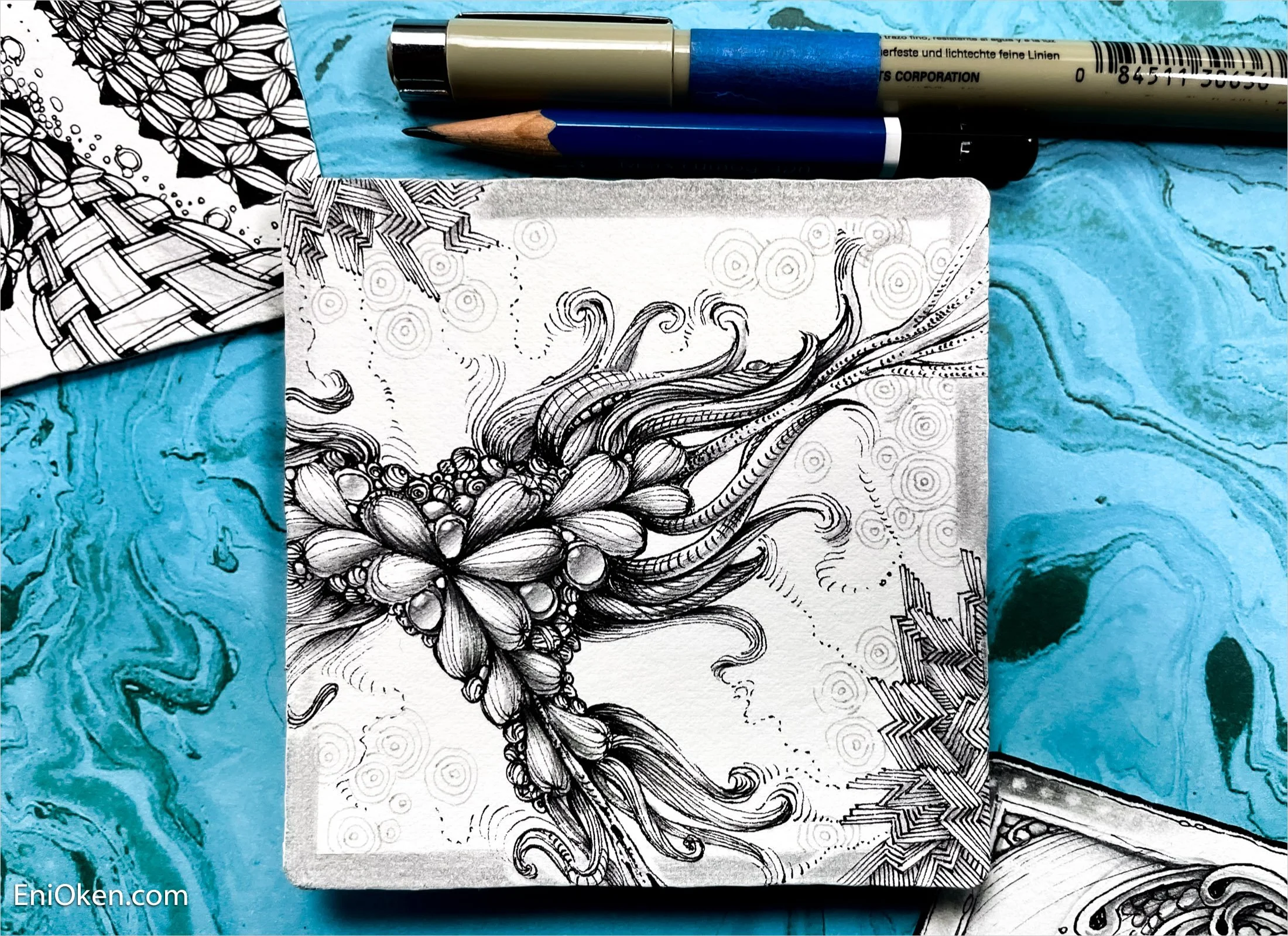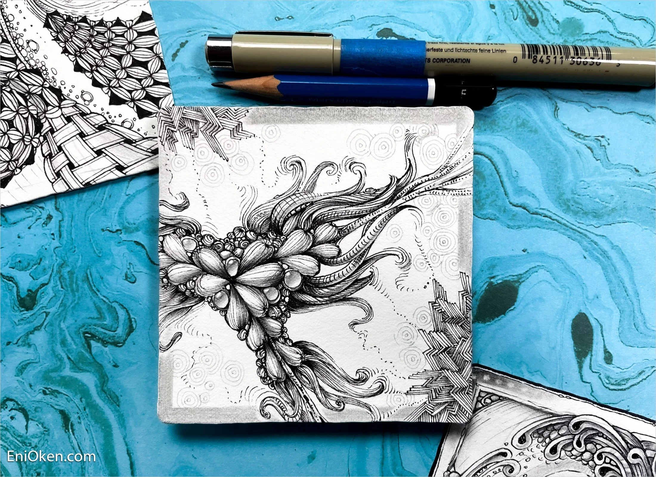 Another Art Raffle session I ran a few days ago gave me a Triradial string- which is essentially a very simple radial string that divides the tile into three large parts. I also got Ennies (which is very similar to Flux), Squid and Sez (all Zentangle). I also Dex but didn't use it, and I got Zello, my own tangle.